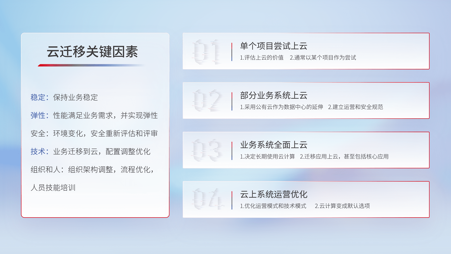 结合实际业务,,,从规划设计、、云平台选型、、云原生改造、、数据迁移、、集成交付,,,,迁移全过程为客户识别最佳上云路径,,做好风险识别管理,,,设计网络架构、、、、身份权限、、、安全审计合规、、、操作审计、、、日志审计、、、、监控告警策略、、、、多站点容灾设计等,,,,对云上基础设施进行整体规划,,,提升IT治理水平,,,,以满足弹性、、、、高可用、、、、高性能的需求。。。